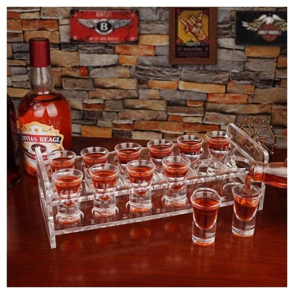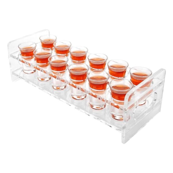 A sturdy frame designed to securely hold 12 shooter glasses. Durable construction, ideal for bar and catering service.