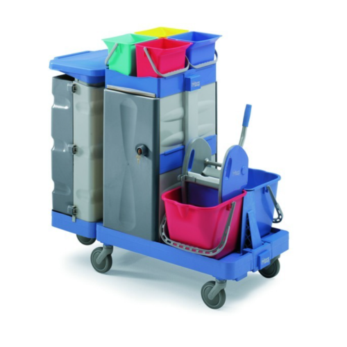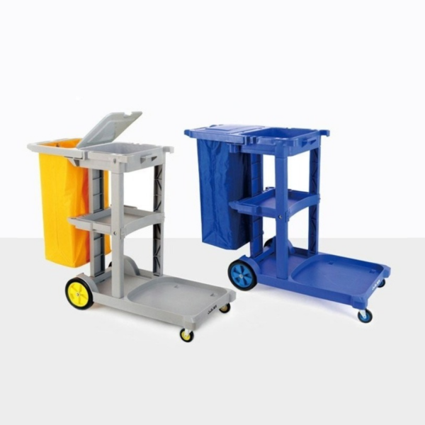 Durable janitorial trolley designed for flexibility and organized storage. Suitable for housekeeping teams in commercial settings.